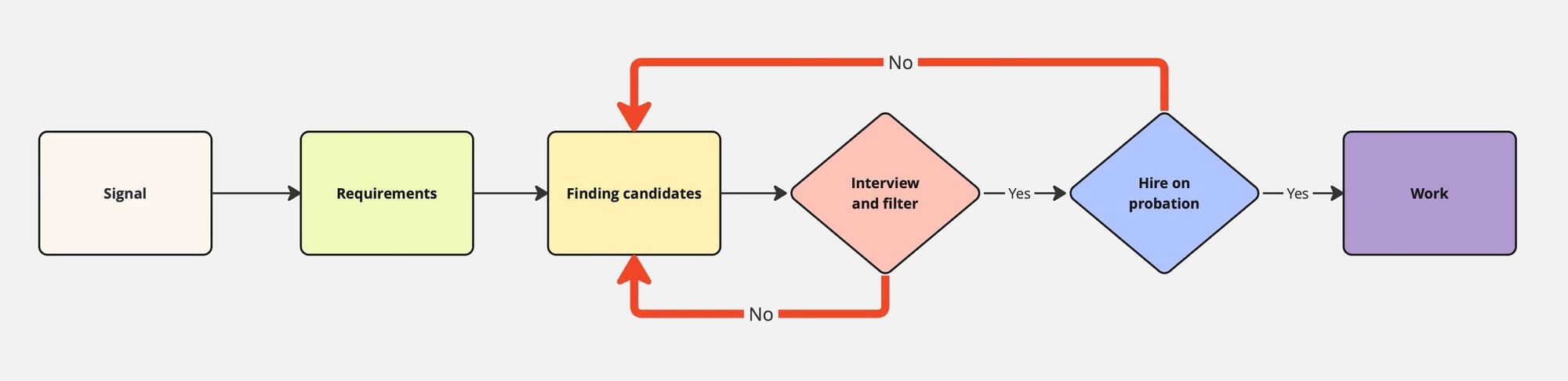 Any of these can be a signal to stop. Not to pause for a week and then repeat the same, but to actually go back one or two steps left in the flow and review them. Maybe the job description is wrong. Maybe the sourcing channel brings completely off-profile candidates. Maybe the interview content does not match the actual work. Maybe compensation is clearly out of market.